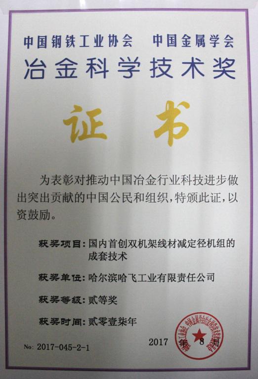 為表彰對推動中國冶金行業科技進步做出的突出貢獻,冶金科學技術獎獎勵委員會決定對78個項目授予2017年中國鋼鐵工業協會、中國金屬學會冶金科學技術獎,我公司“國內首創雙機架線材減定徑機組的成套技術”獲得二等獎。我公司是冶金系統外的冶金設備制造商獲得此獎項,標志雙機架線材減定徑機組成套技術對中國冶金行業科技創新、技術進步有重要意義。